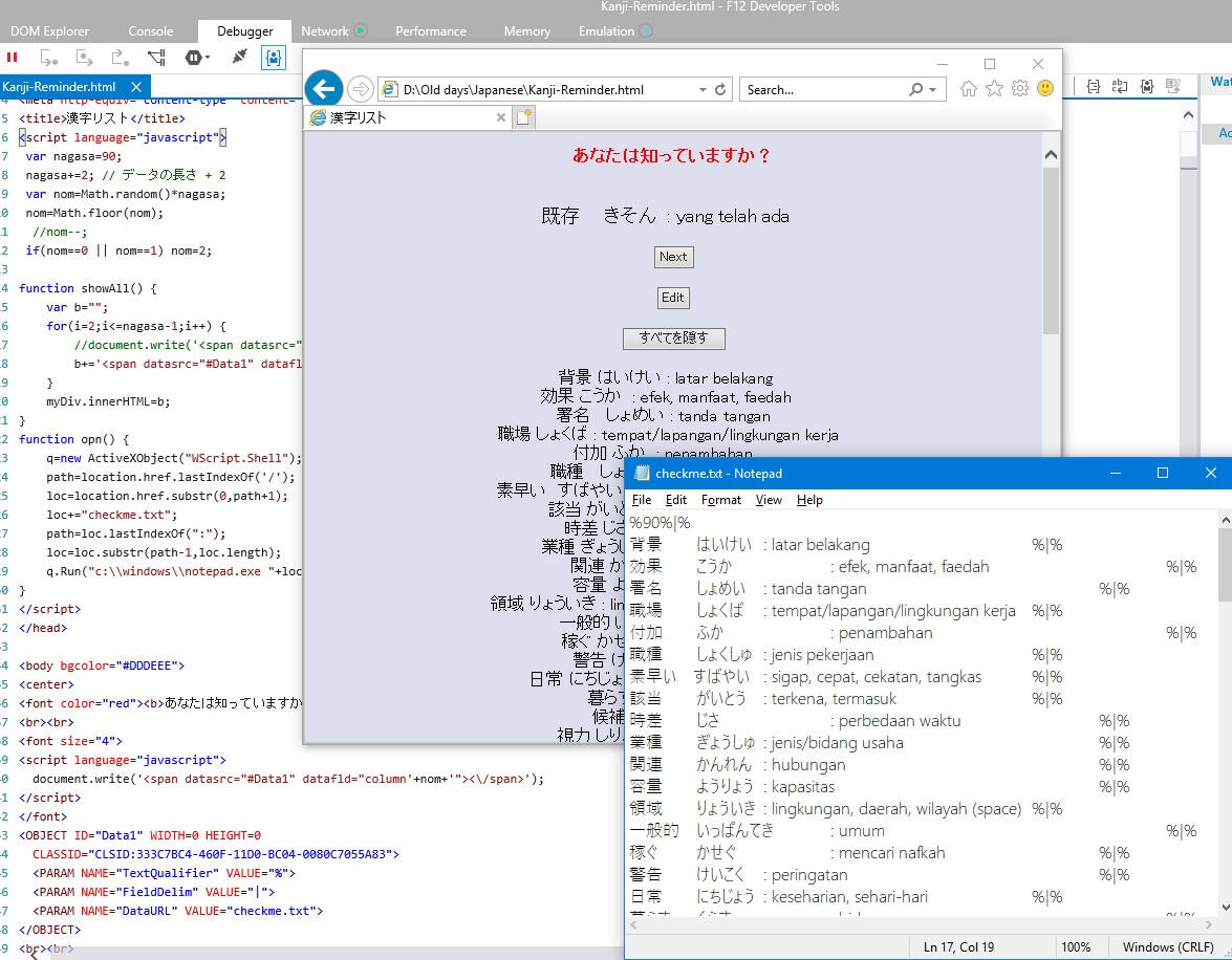 Kanji Reminder for IE 5, reading .txt file as the data source.